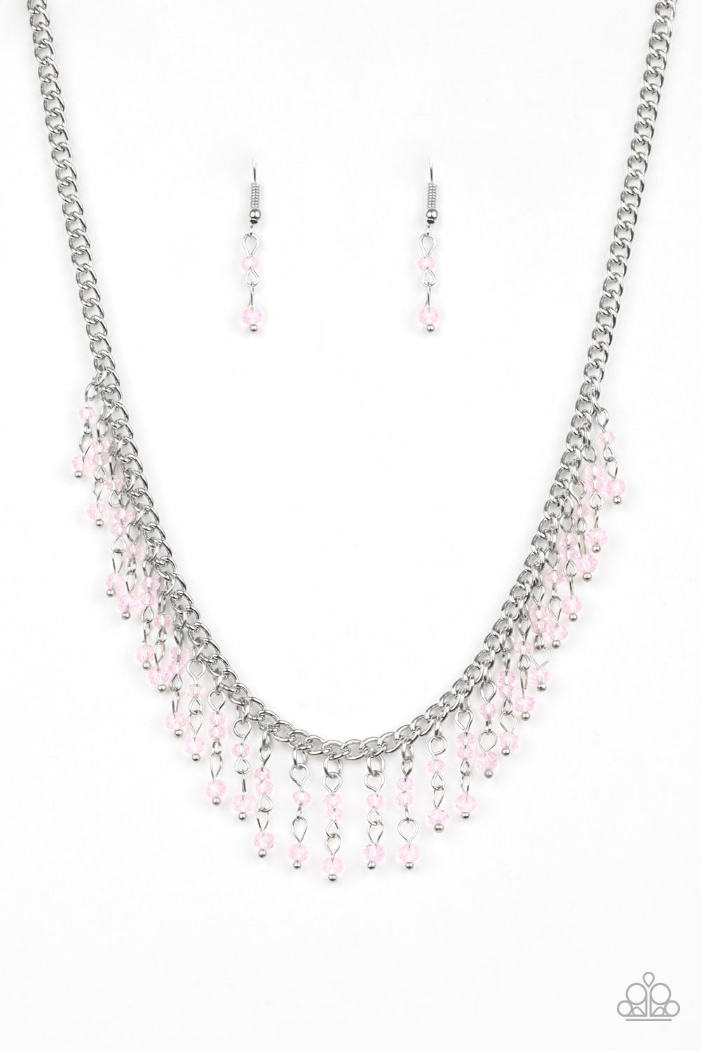 A collection of dainty pink crystal-like beads are threaded along stacks of metallic rods, creating a twinkling fringe below the collar. Features an adjustable clasp closure.