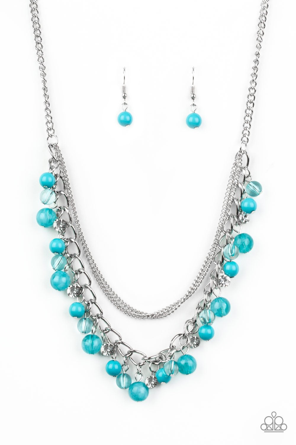 Infused with layers of mismatched silver chains, glassy, polished blue, and glittery white rhinestones swing from the bottom of a bold silver chain, creating a bubbly fringe below the collar. Features an adjustable clasp closure.